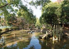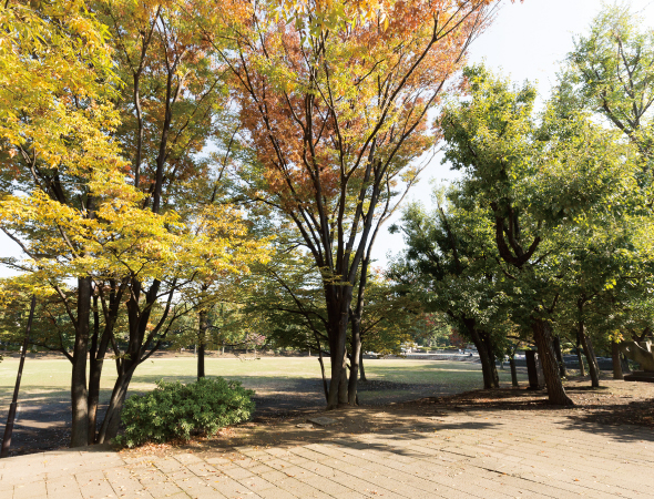 大田区内最大級の約99,000㎡の面積に四季折々の自然が広がる園内には、子どもたちが釣り糸を垂れるひょうたん池、見晴らし広場、23区内で唯一の協会公認のフィールドアスレチック施設などが設けられています。テニスコートや弓道場、アーチェリー場などのスポーツ施設も併設。